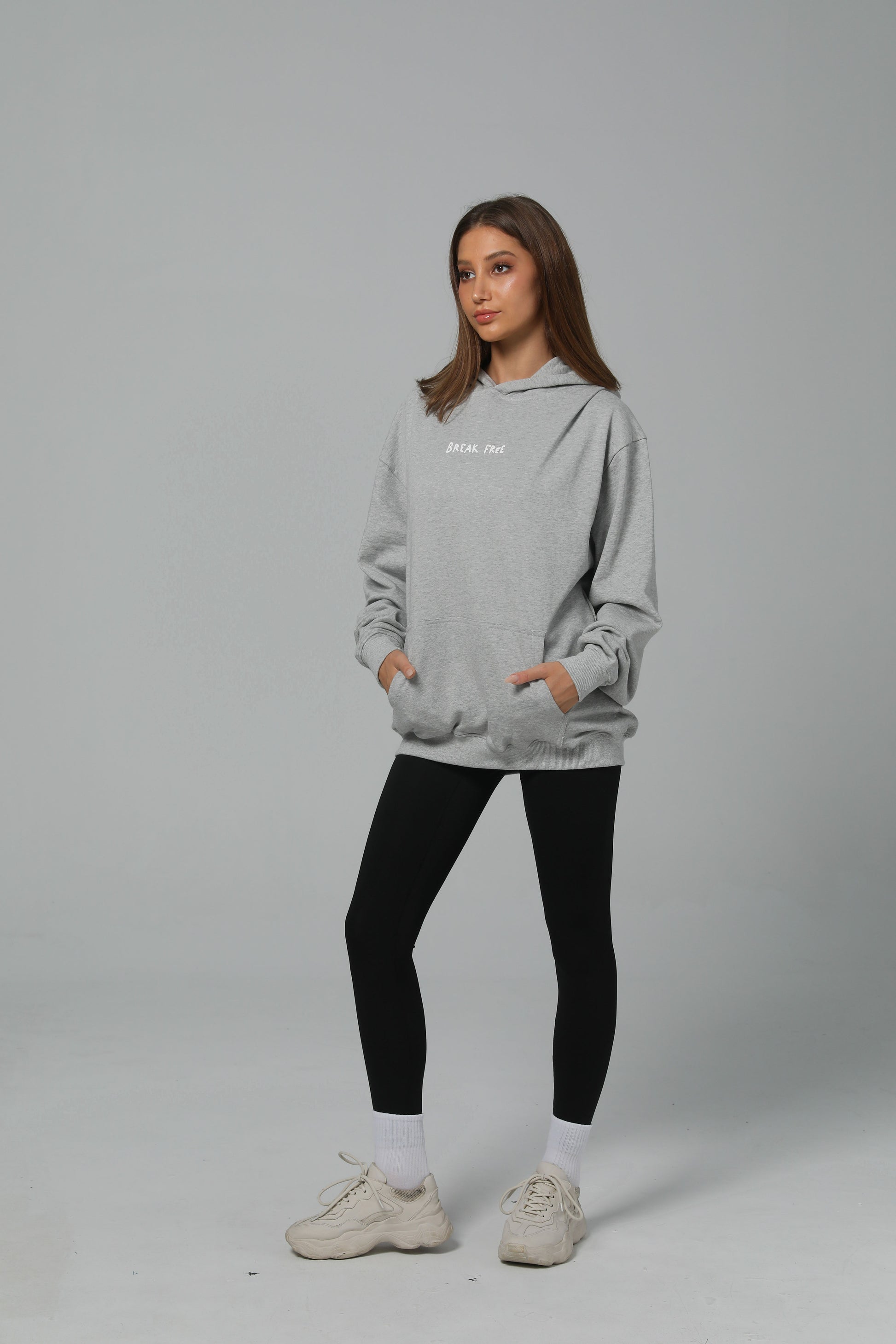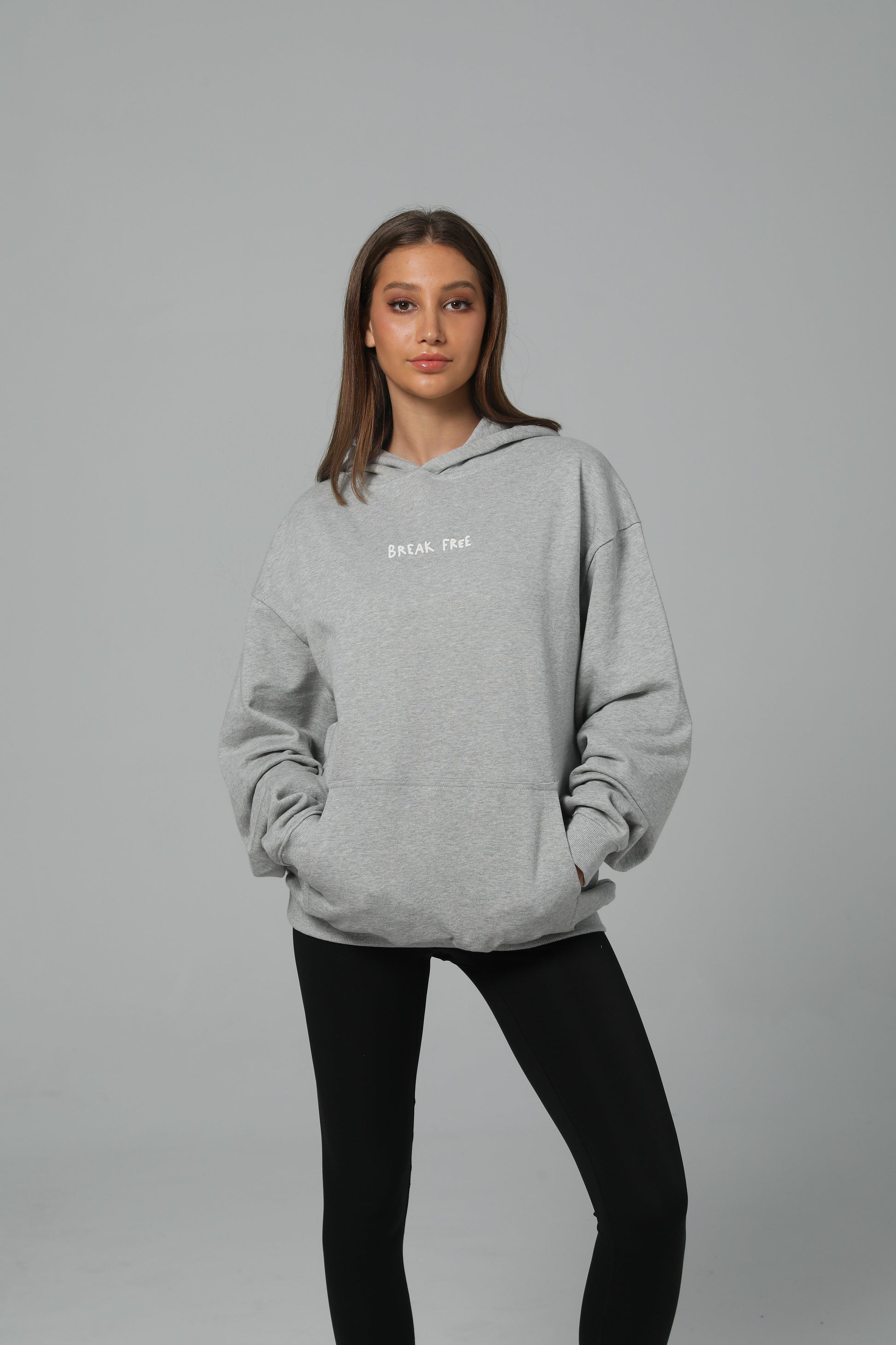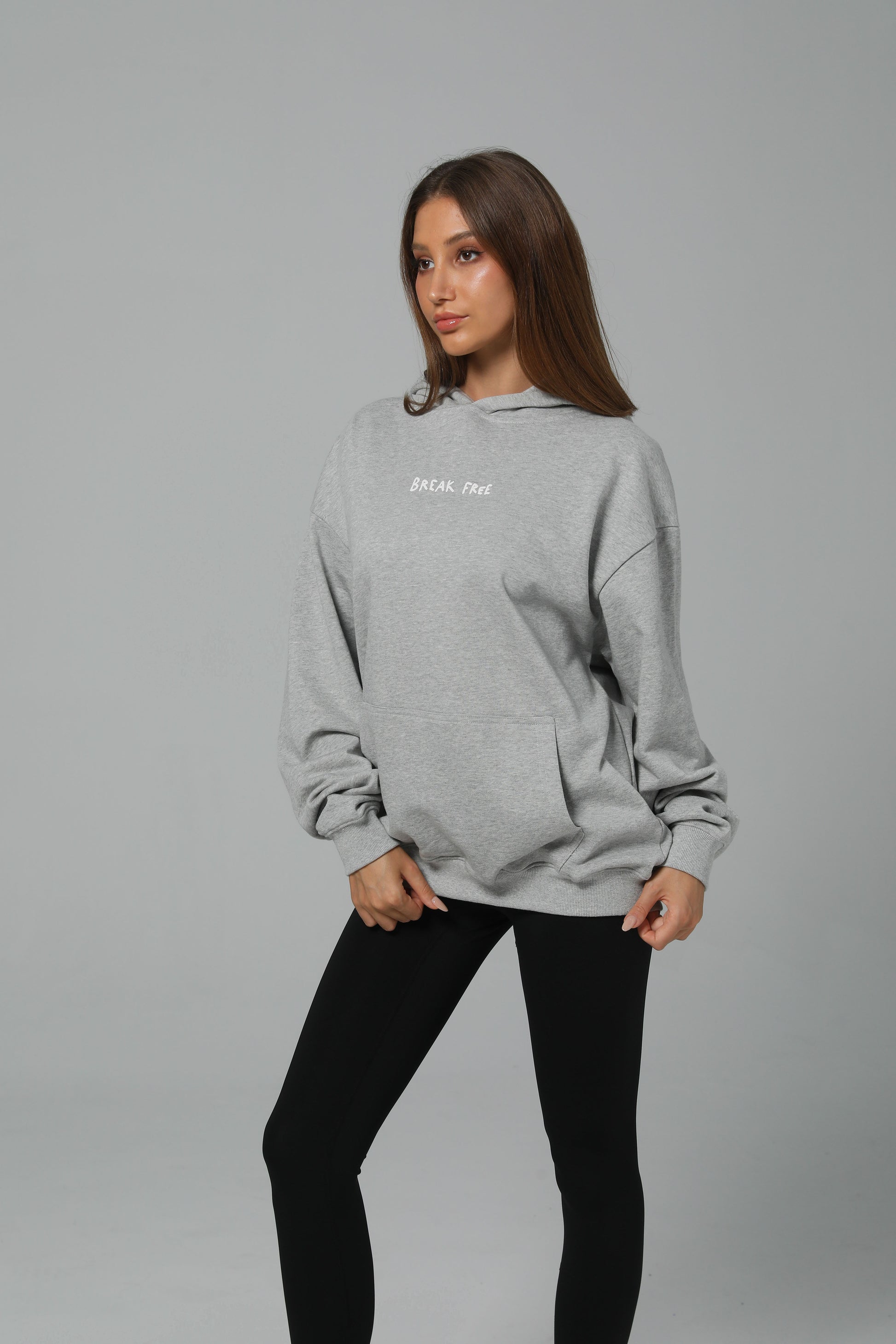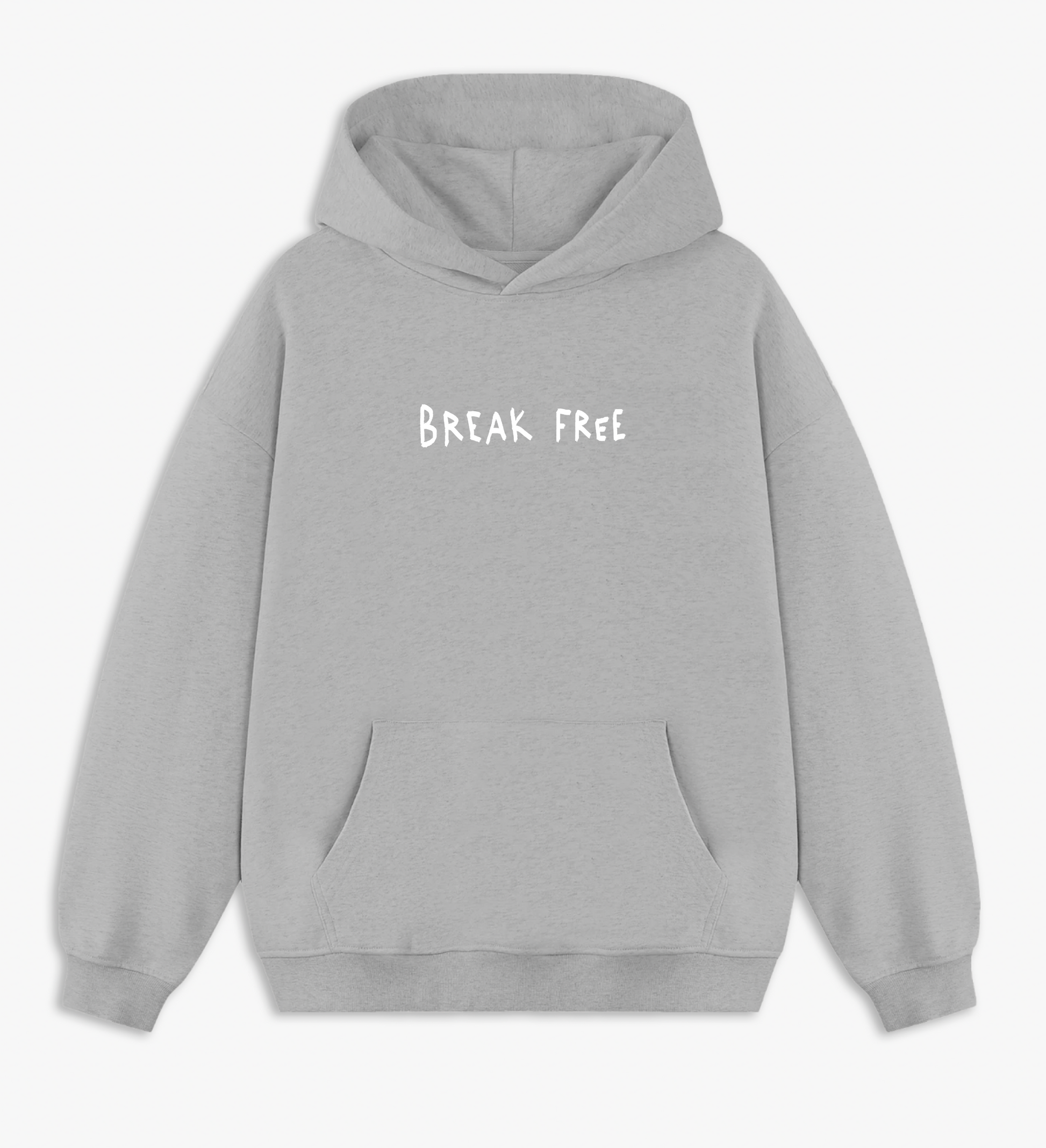 Cloud Gray hoodie with an oversized fit, crafted from a medium weight jersey cotton. Super soft, pre-shrunk and piece dyed for the ultimate jersey. Ribbed hem & cuffs. "Life is Short, Run Long" puff print to the back and "Break Free: puff print to the chest.