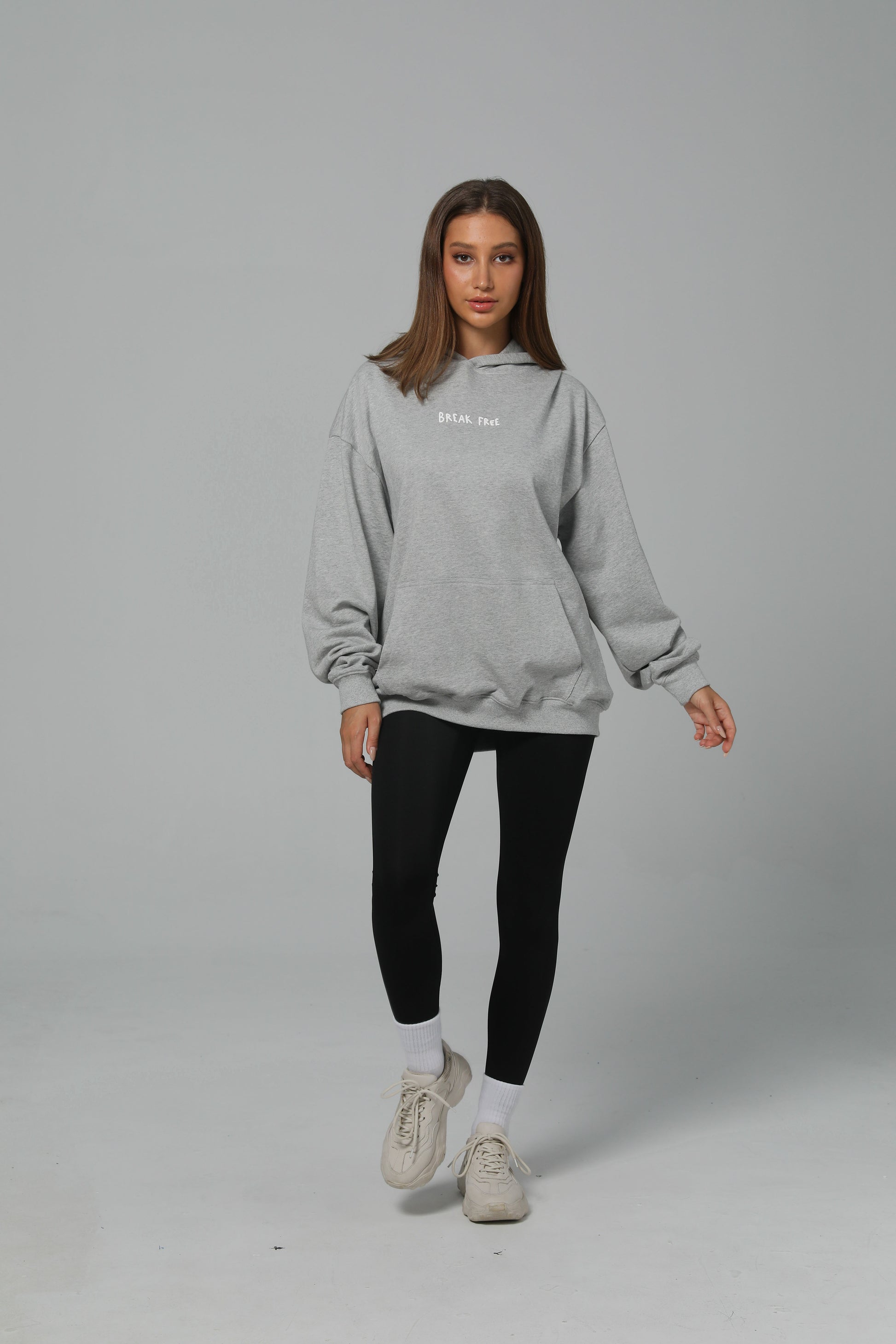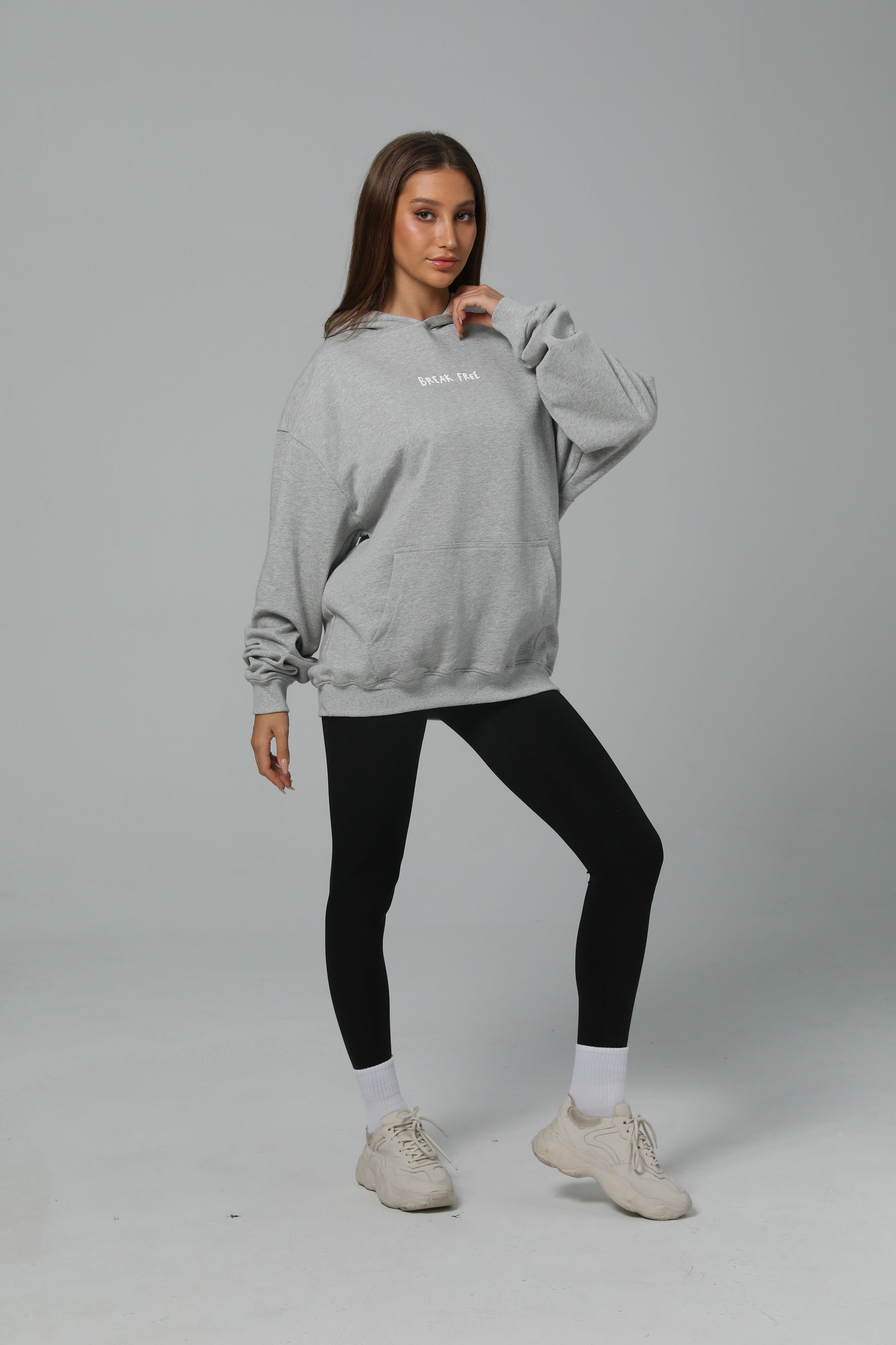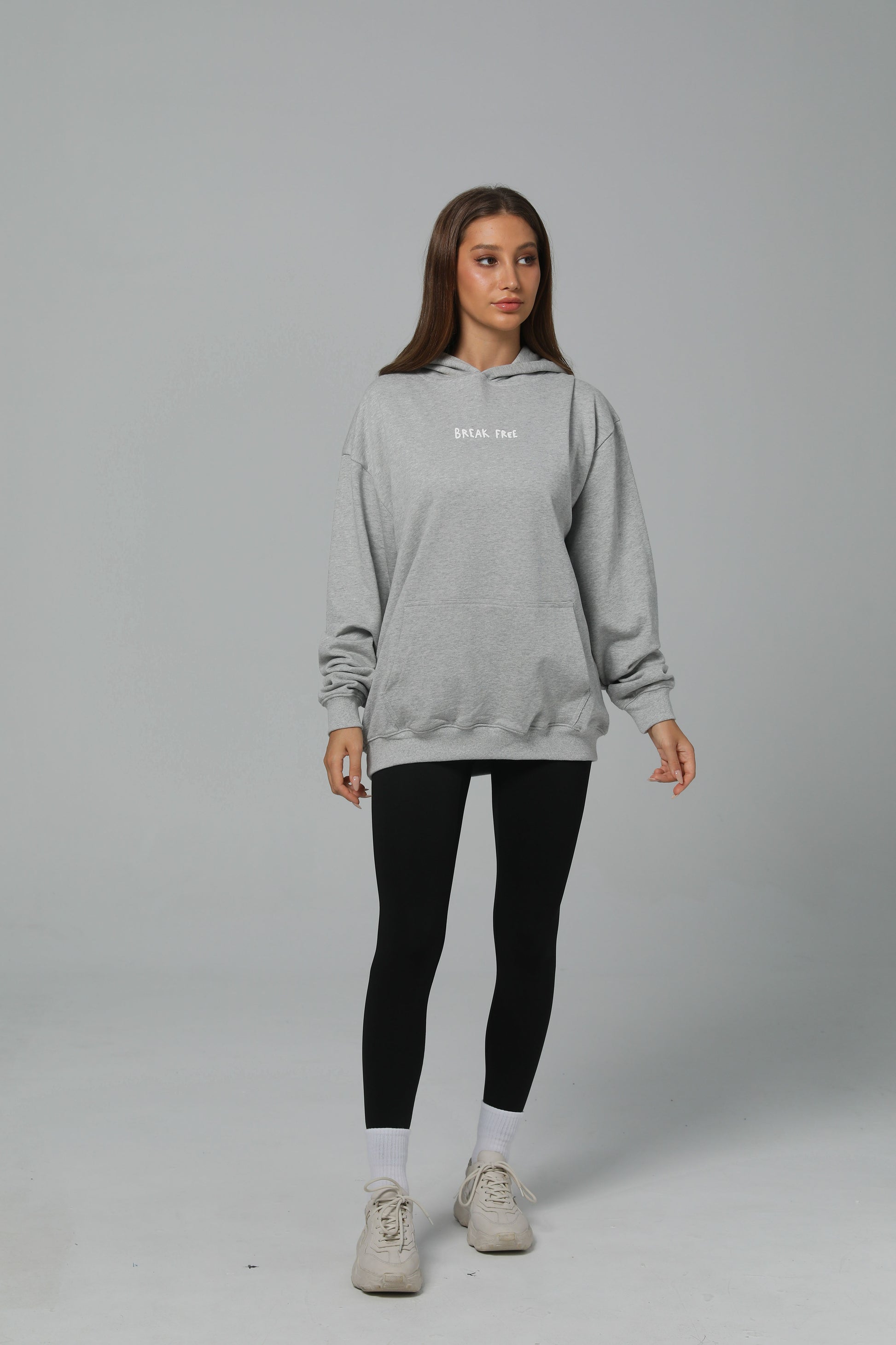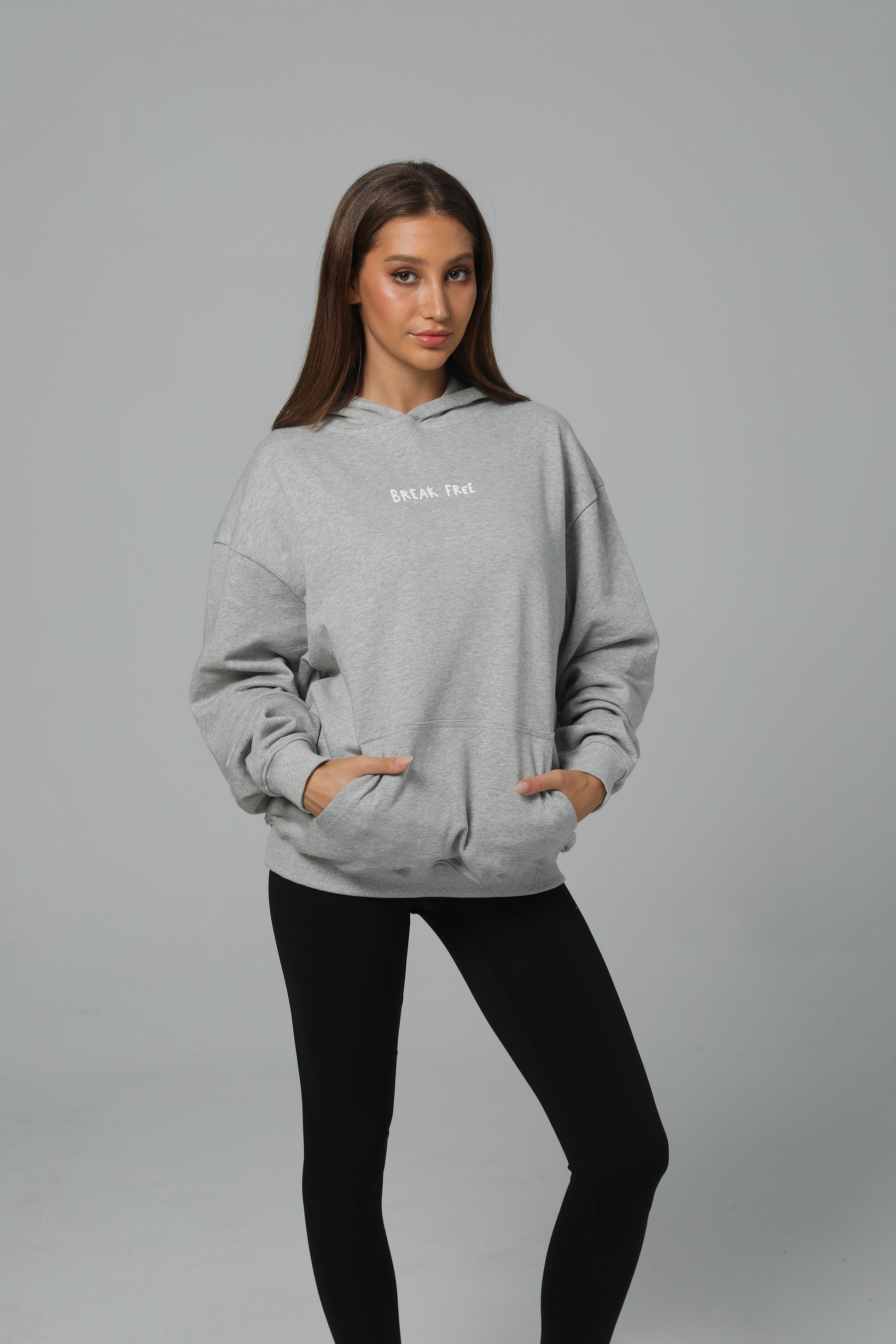Cloud Gray hoodie with an oversized fit, crafted from a medium weight jersey cotton. Super soft, pre-shrunk and piece dyed for the ultimate jersey. Ribbed hem & cuffs. "Life is Short, Run Long" puff print to the back and "Break Free: puff print to the chest.