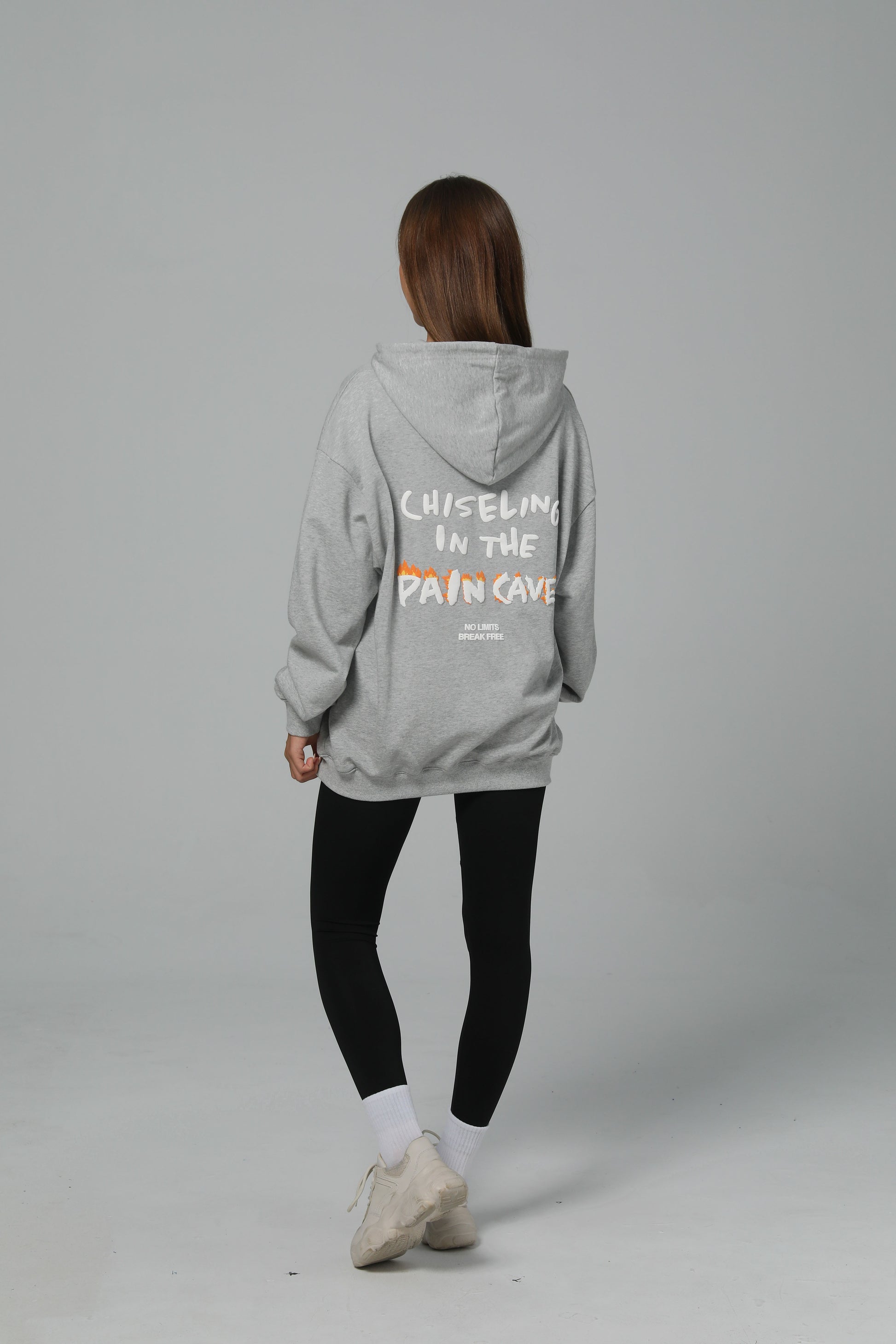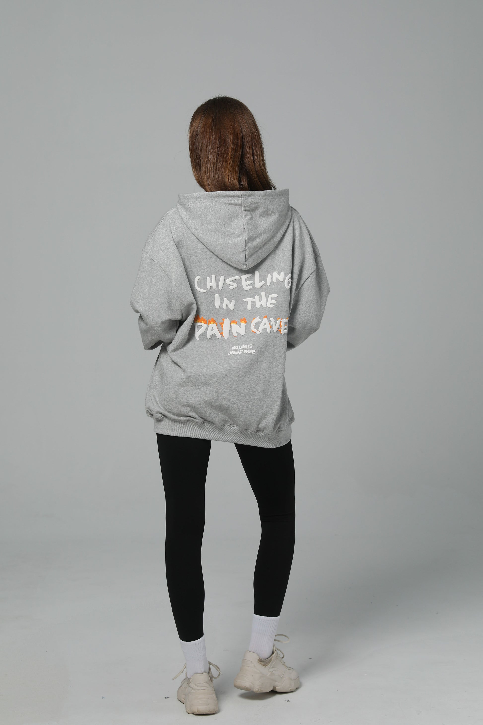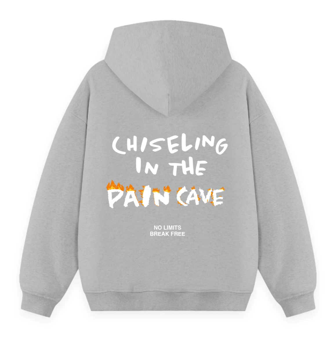 CHISELING IN THE PAIN CAVE HOODIE - CLOUD GRAY - PUFF PRINT