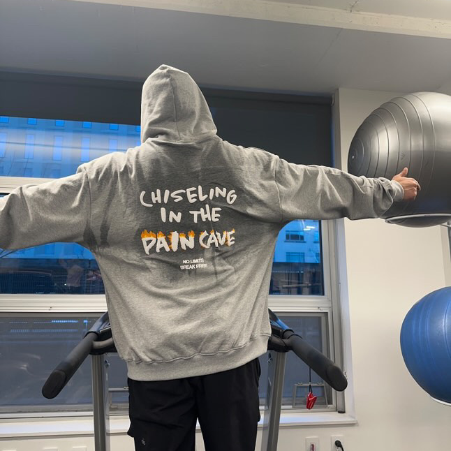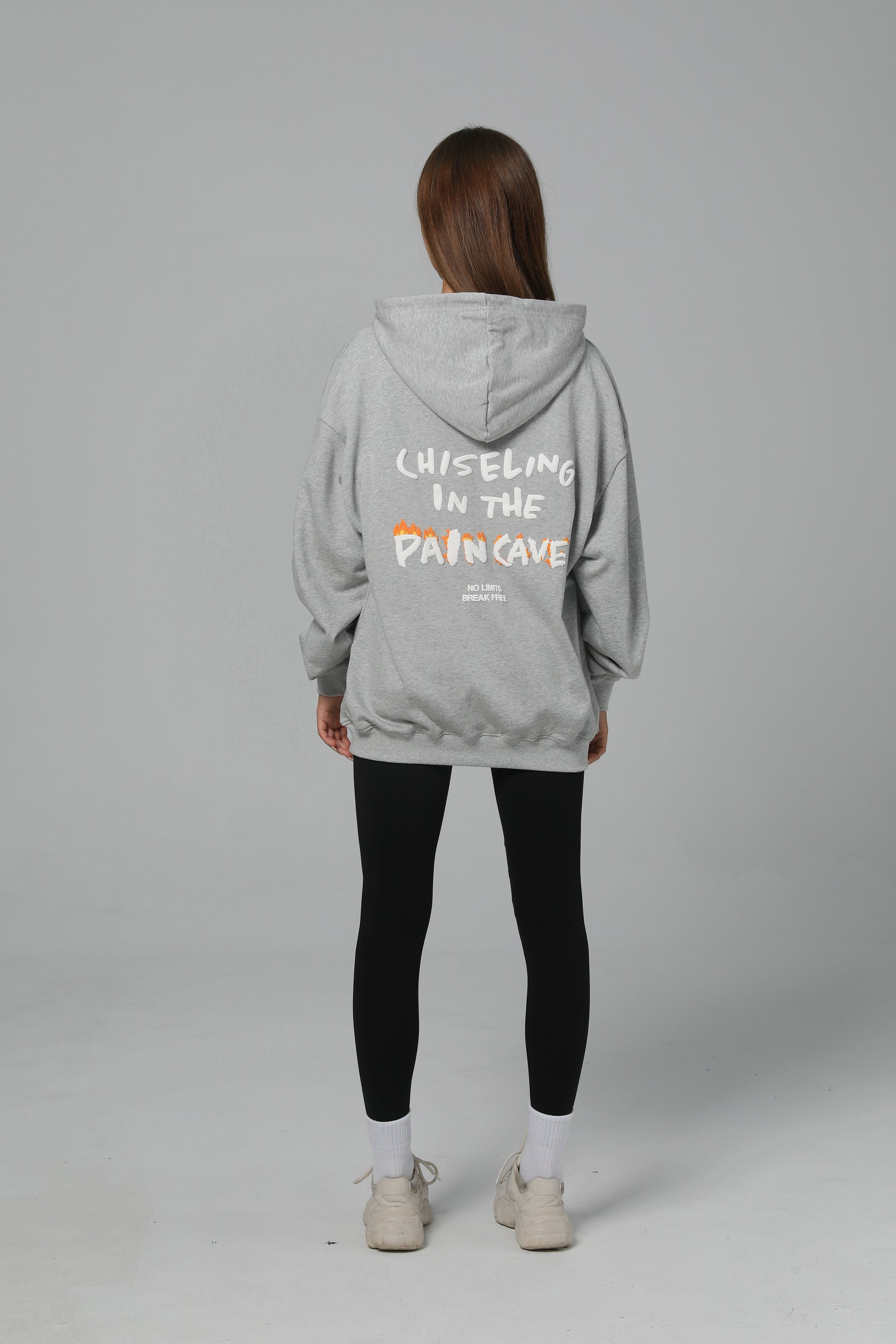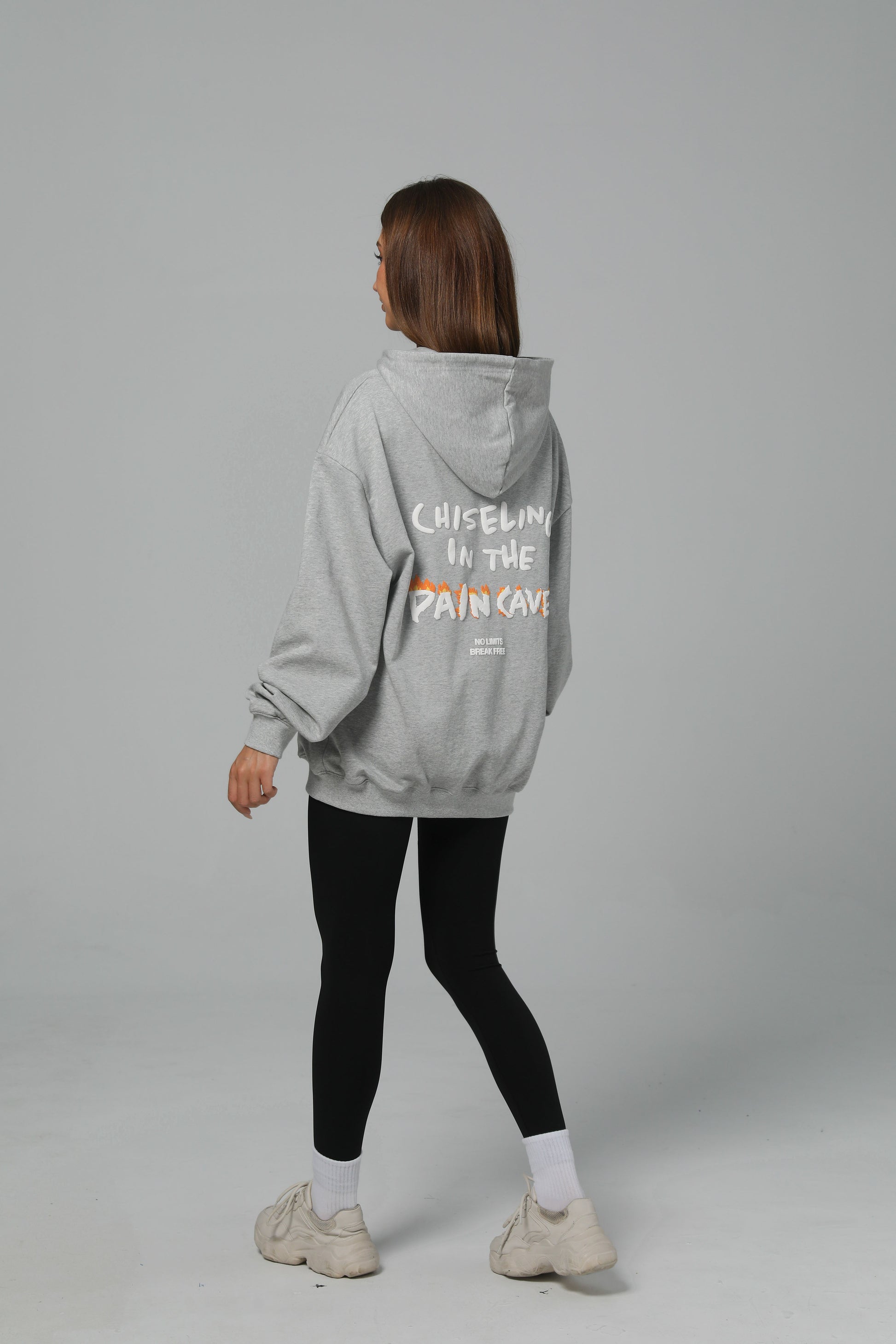 CHISELING IN THE PAIN CAVE HOODIE - CLOUD GRAY - PUFF PRINT