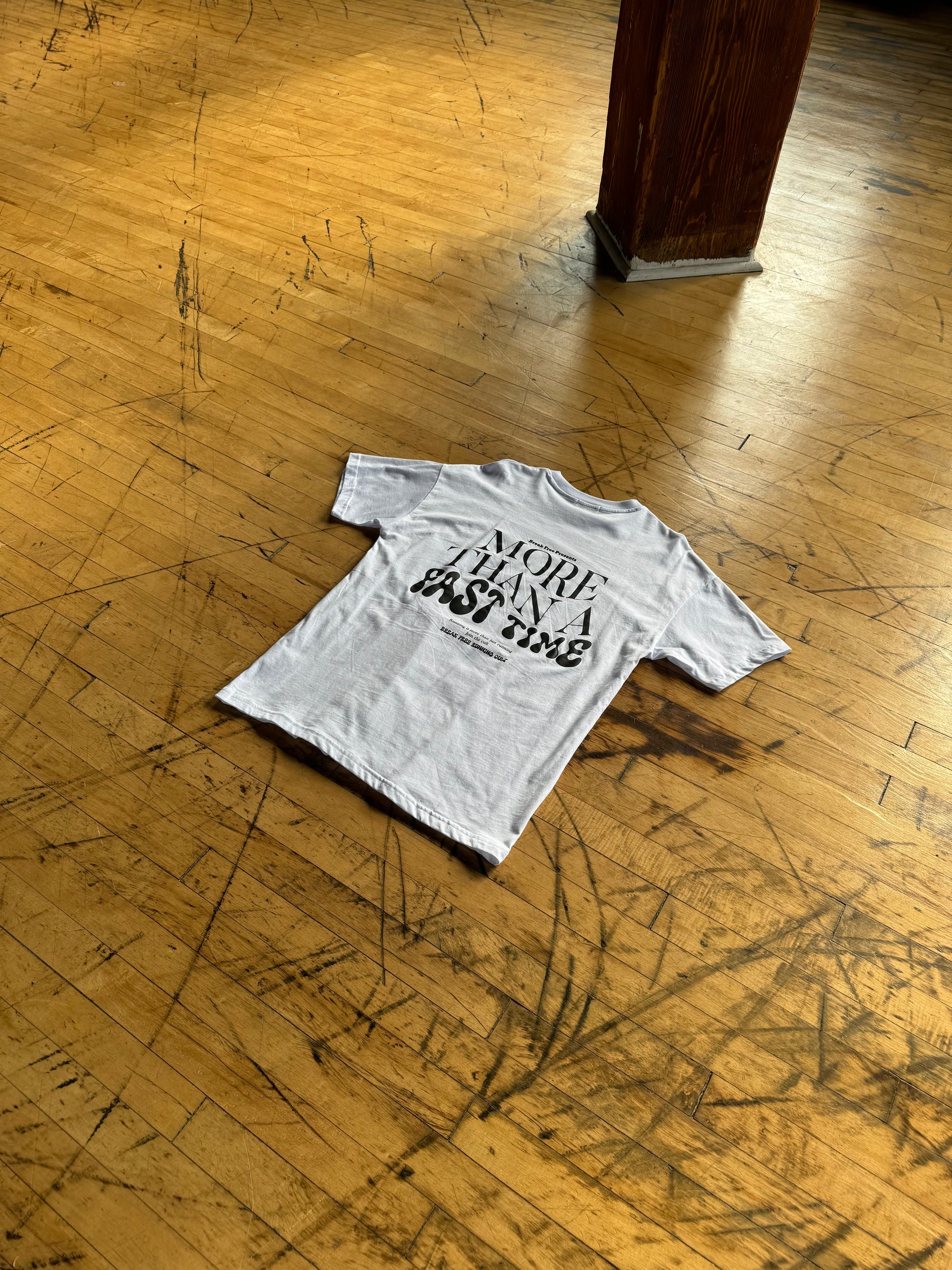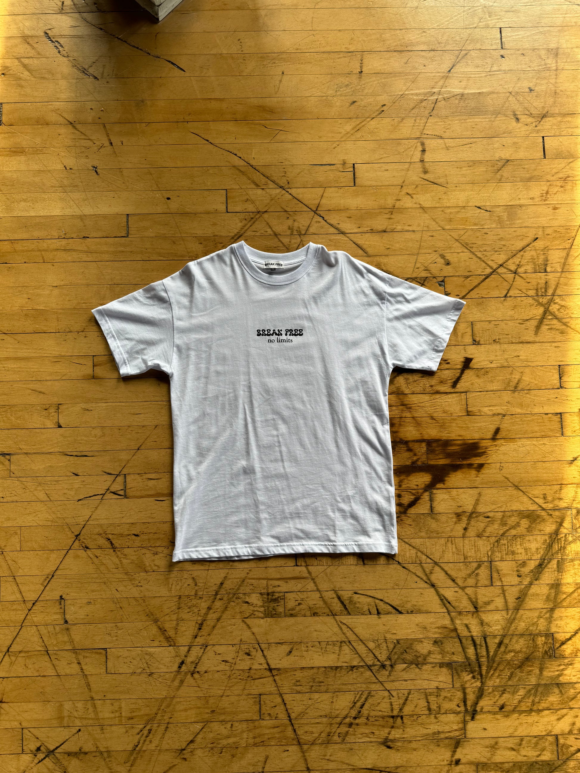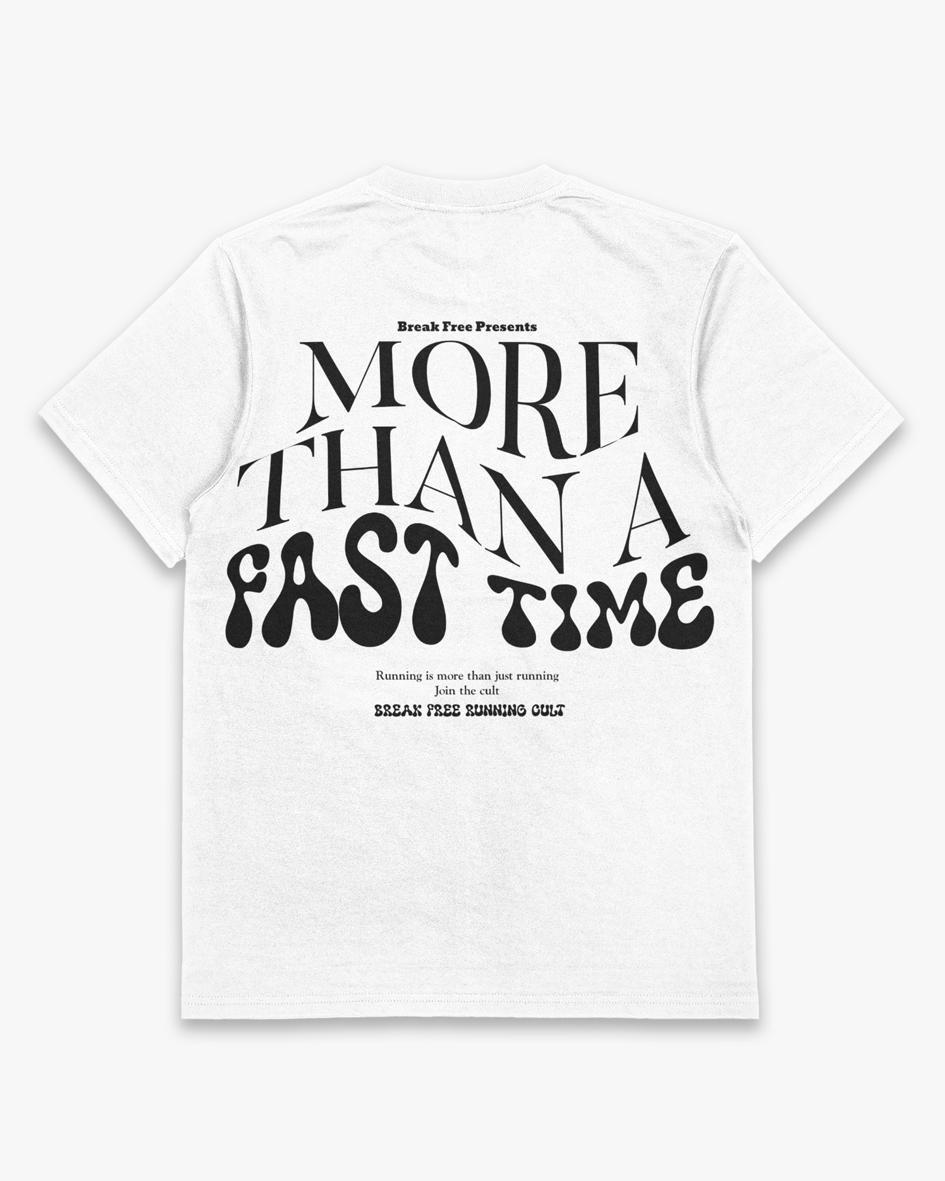 Short sleeve jersey t-shirt in vintage white. Slightly oversized classic fit in a medium weight cotton. Ribbed crewneck collar. “More than a fast time” and “Break Free” graphic branding to the rear and chest.