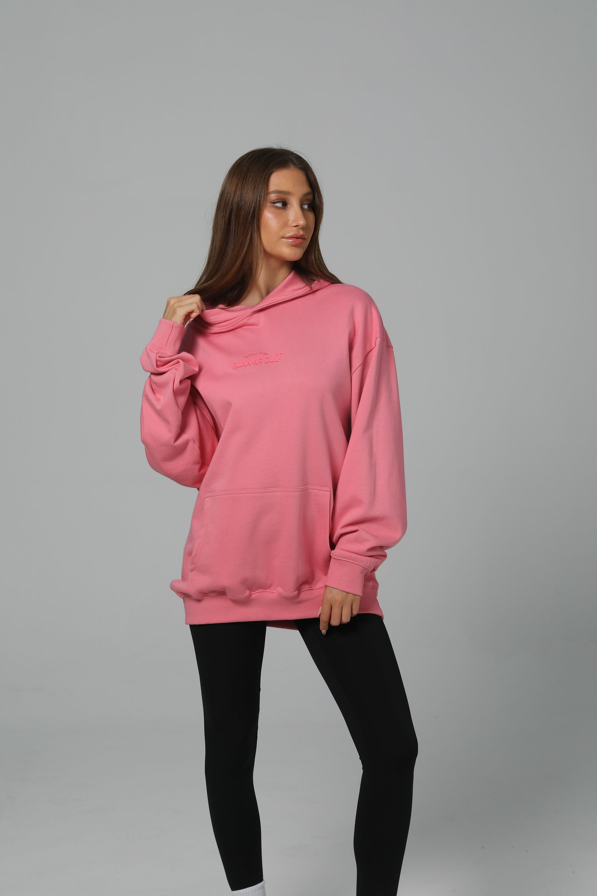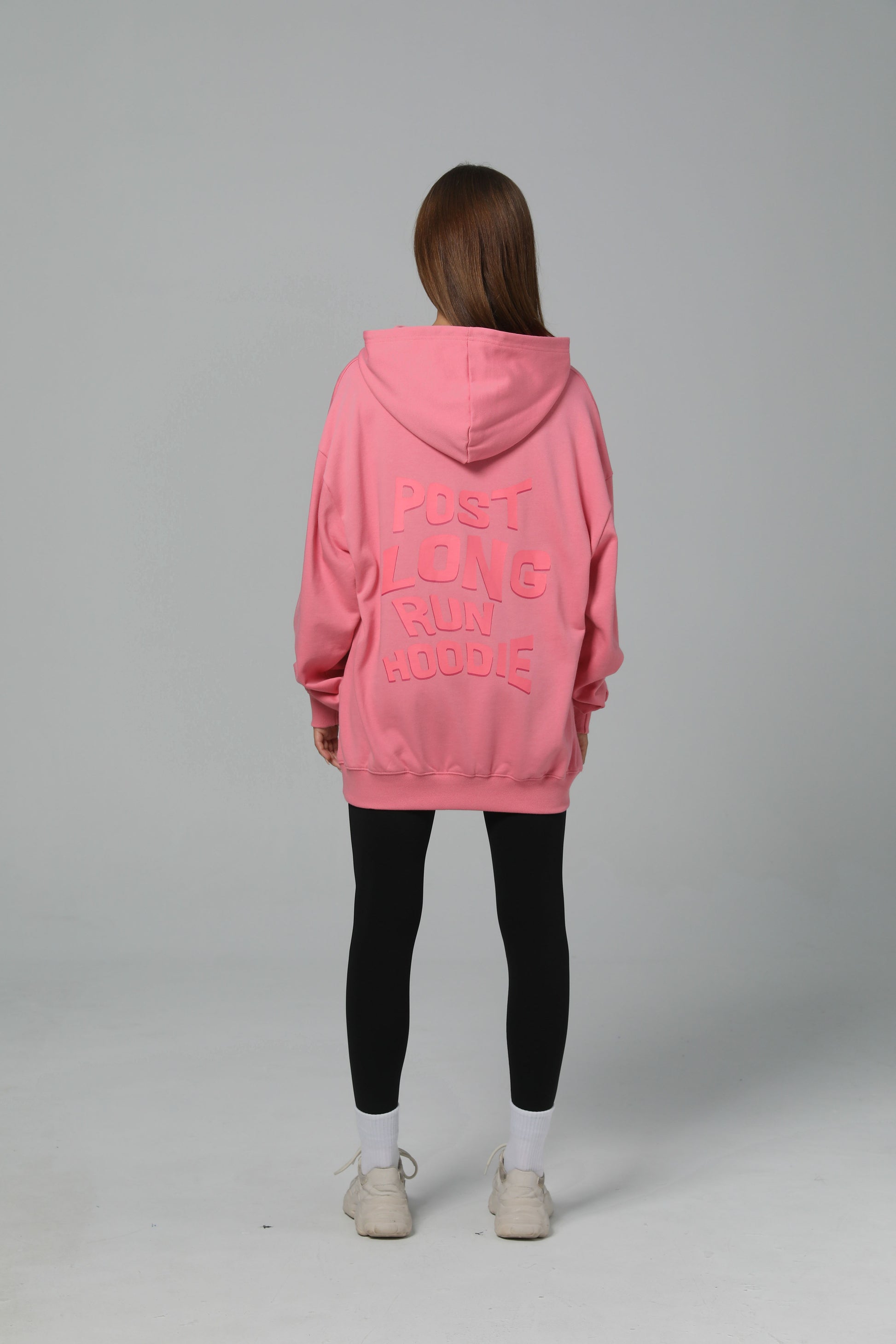 Pink hoodie with an oversized fit, crafted from a heavy weight jersey cotton. Super soft, pre-shrunk and piece dyed for the ultimate jersey. Ribbed hem & cuffs. "Post Long Run Hoodie" print to the back.
