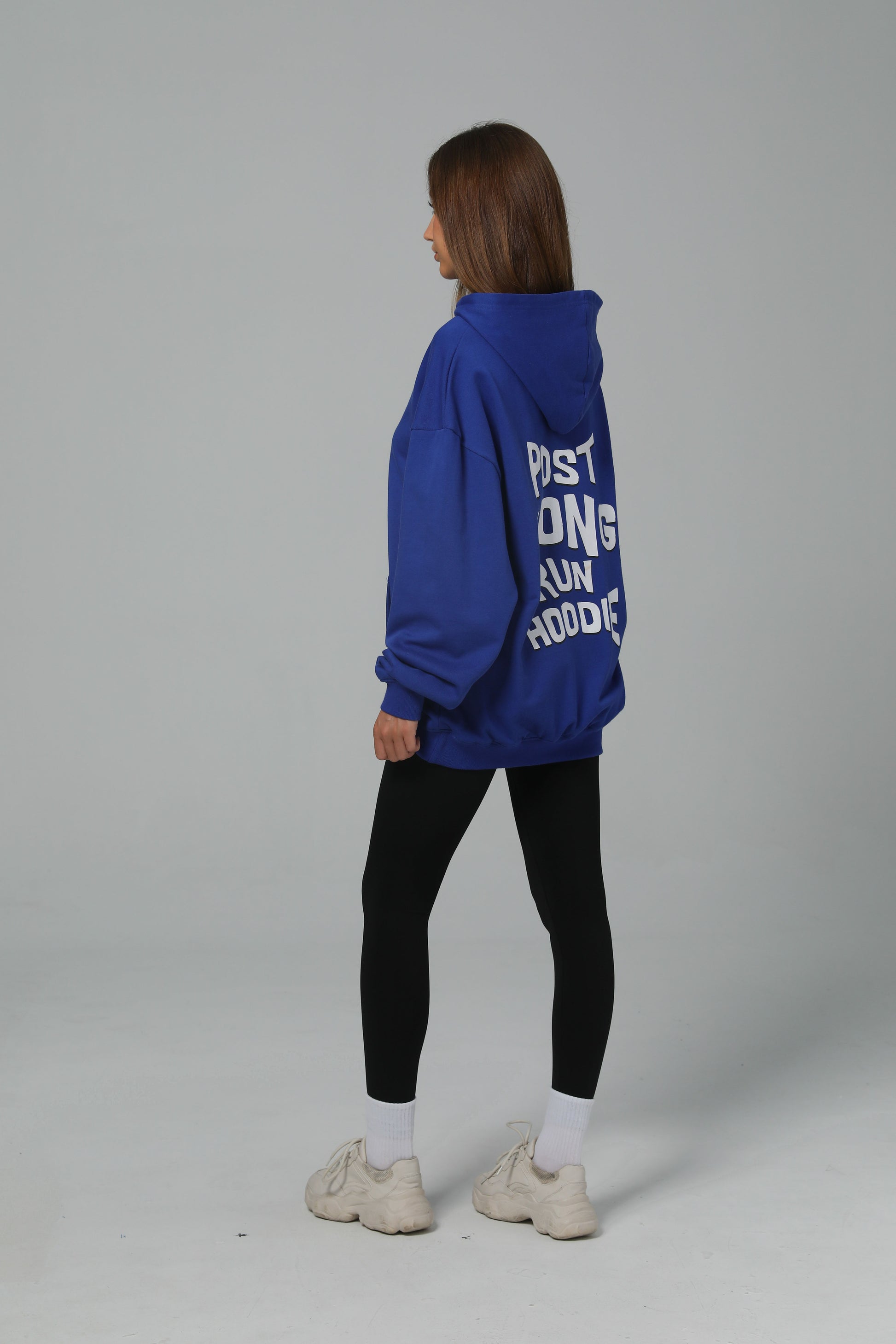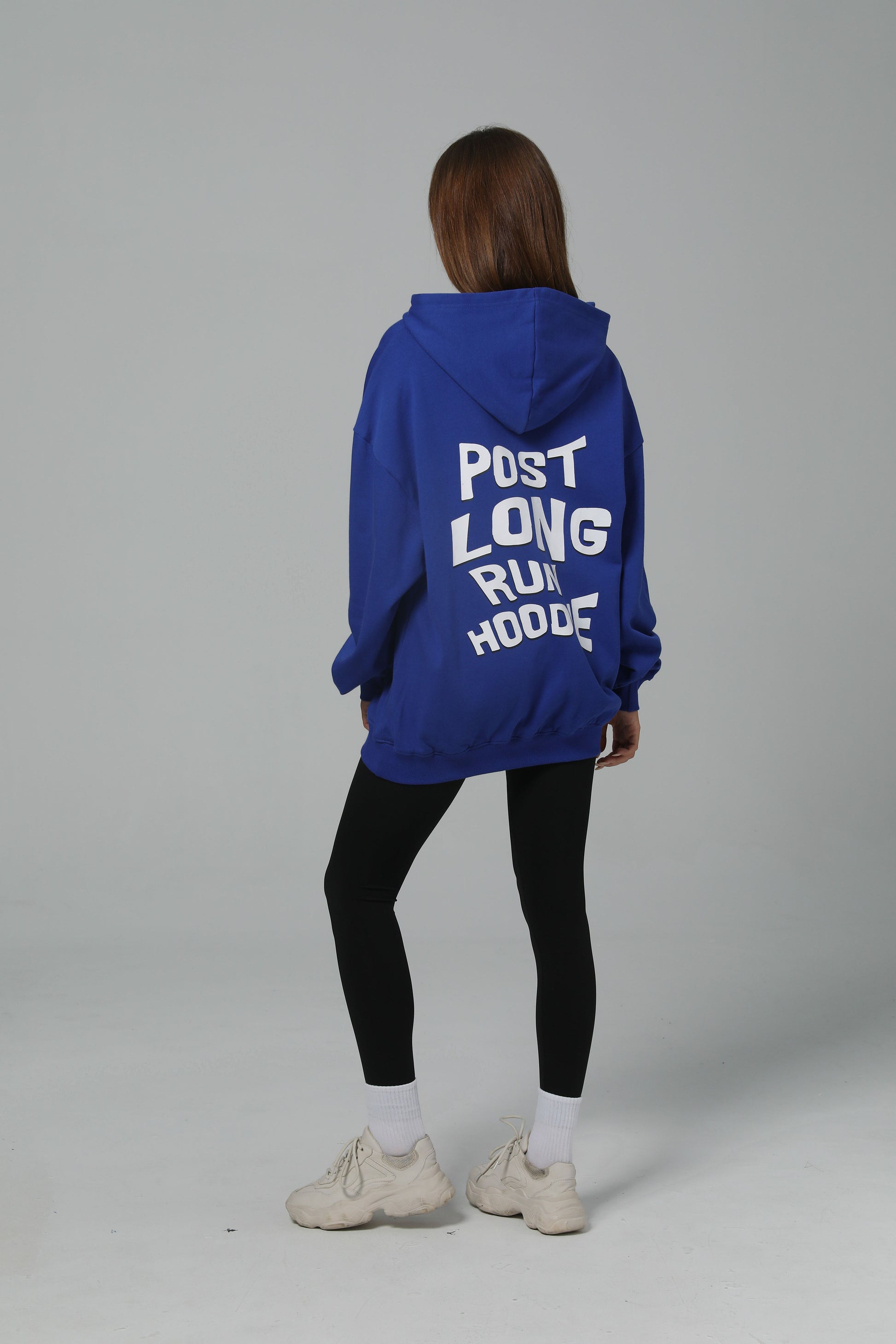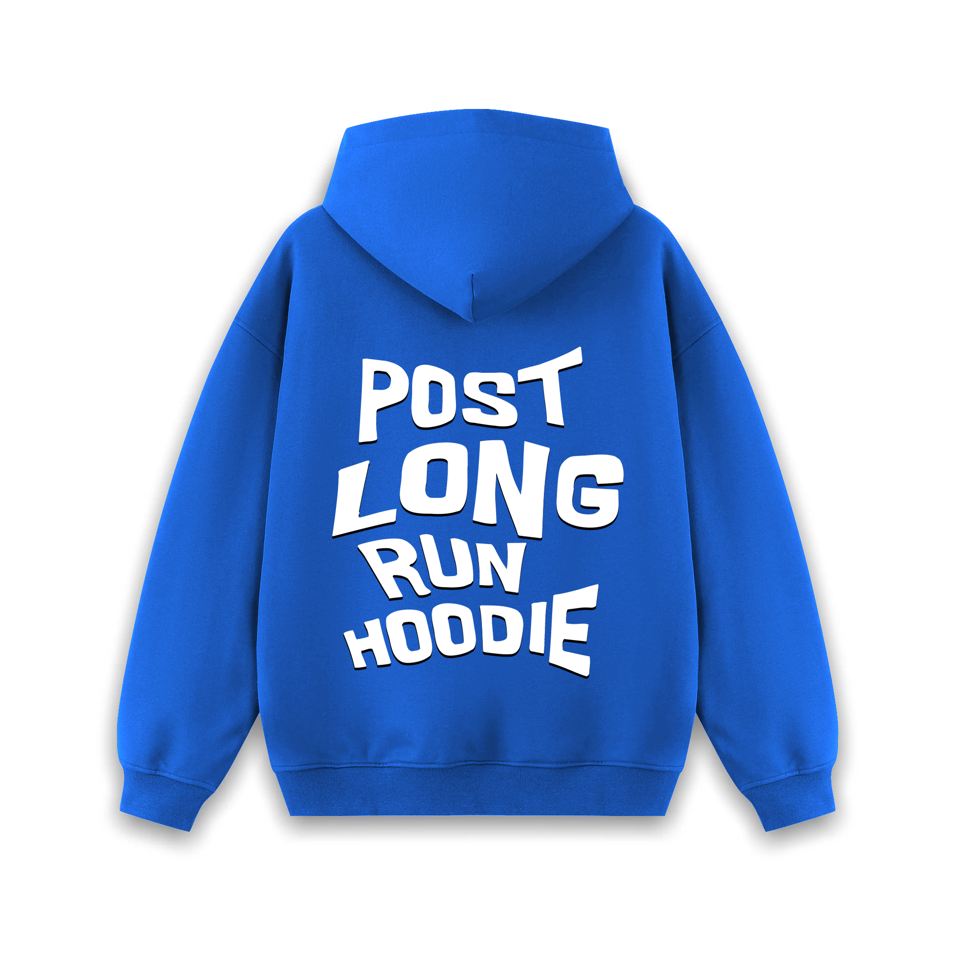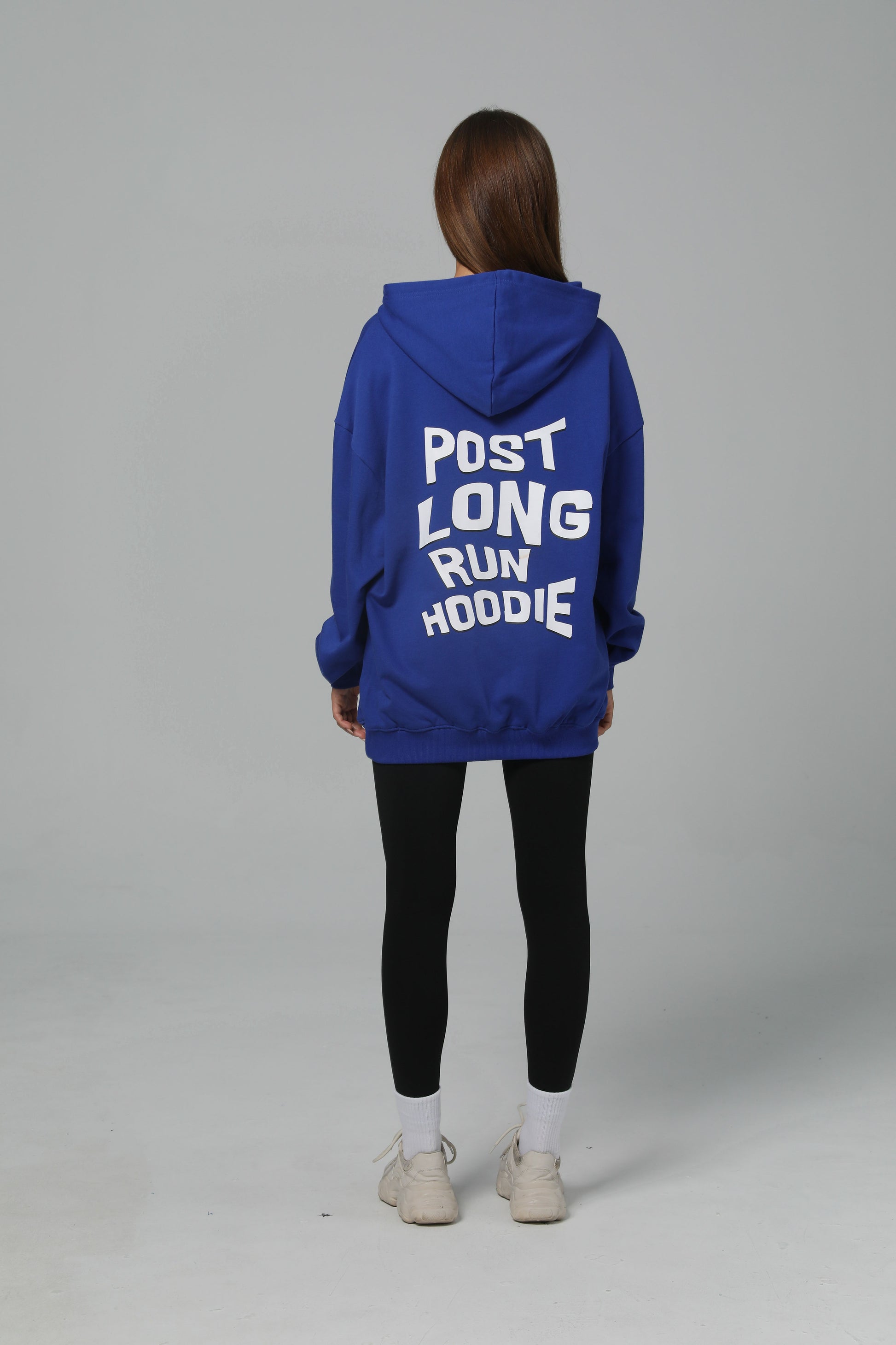 Royal Blue hoodie with an oversized fit, crafted from a medium weight jersey cotton. Super soft, pre-shrunk and piece dyed for the ultimate jersey. Ribbed hem & cuffs. "Post Long Run Hoodie" print to the back.