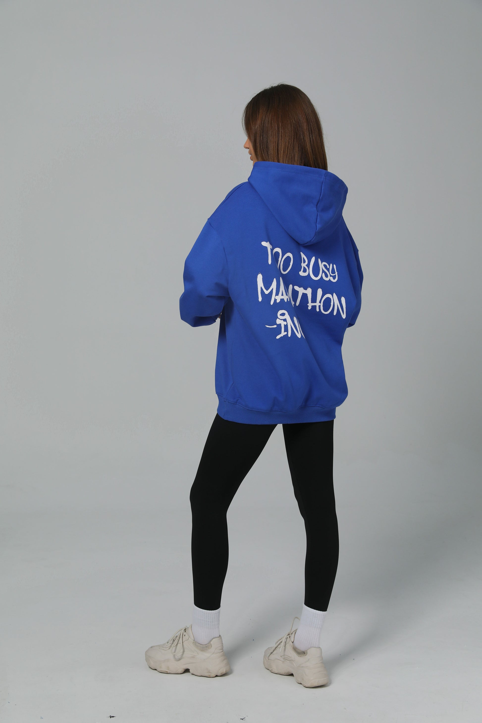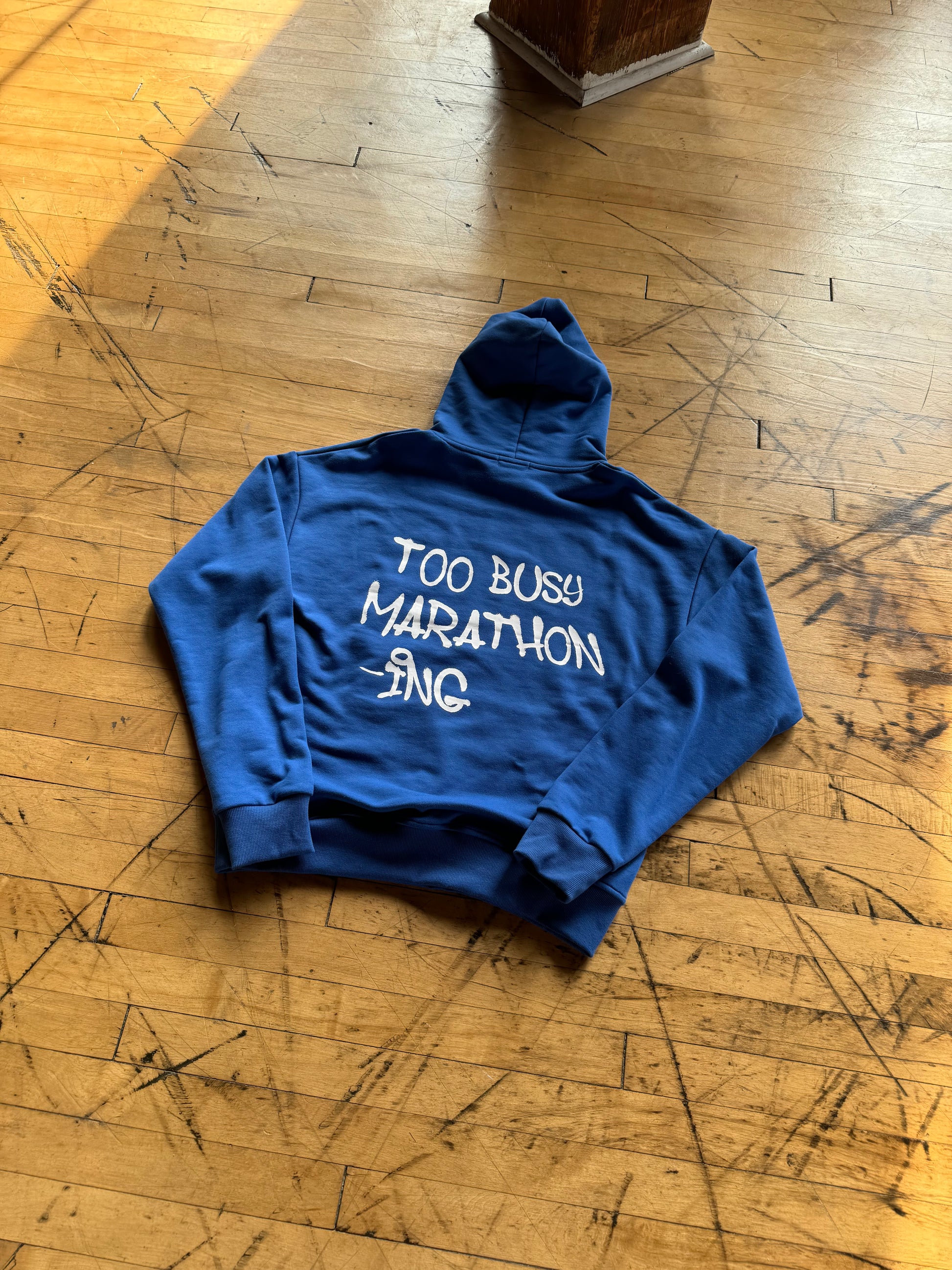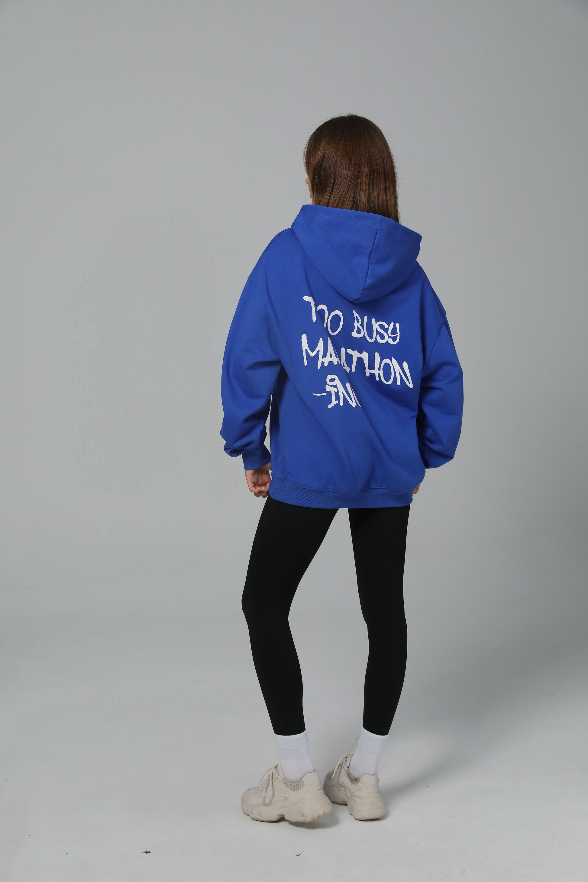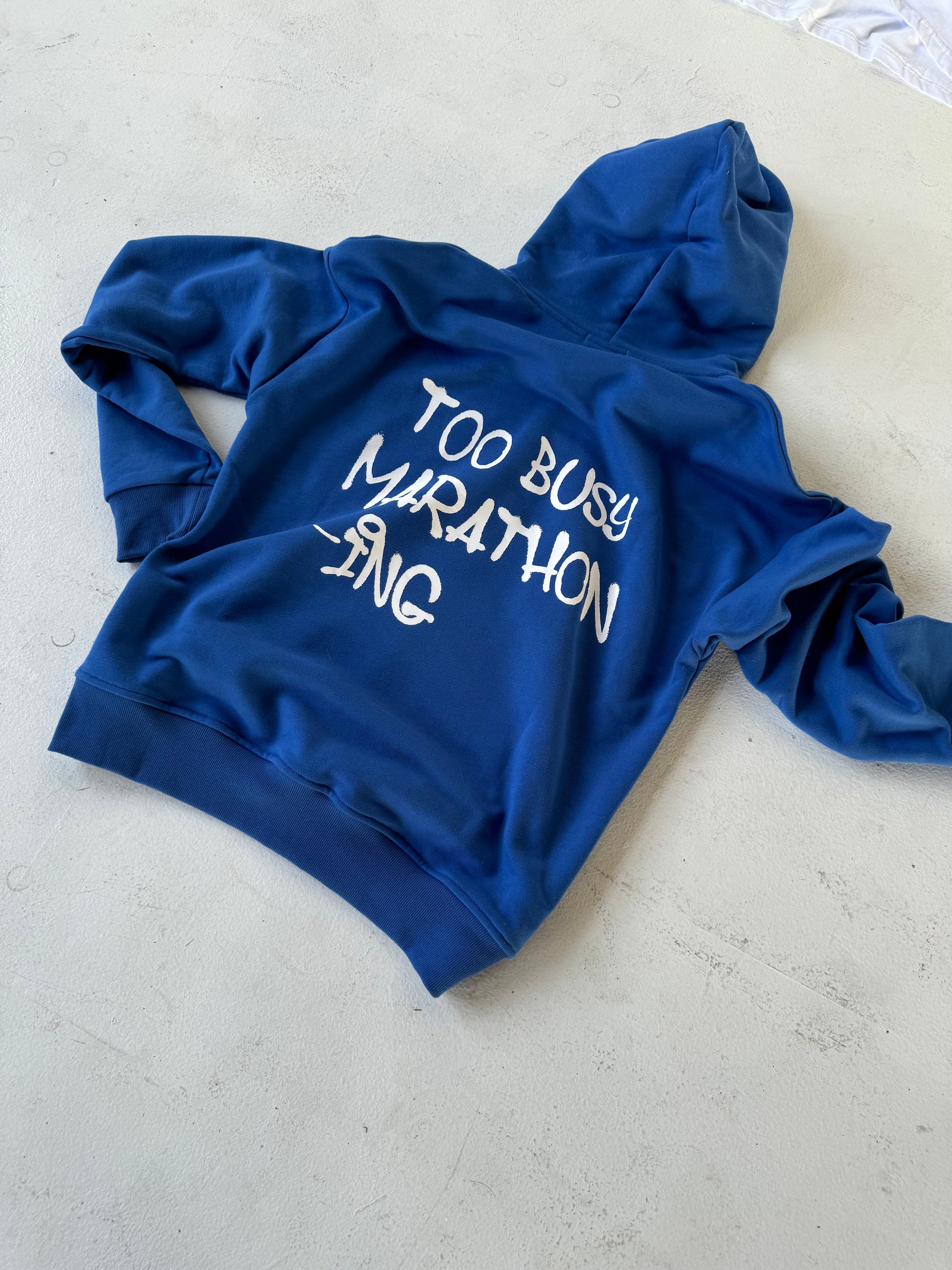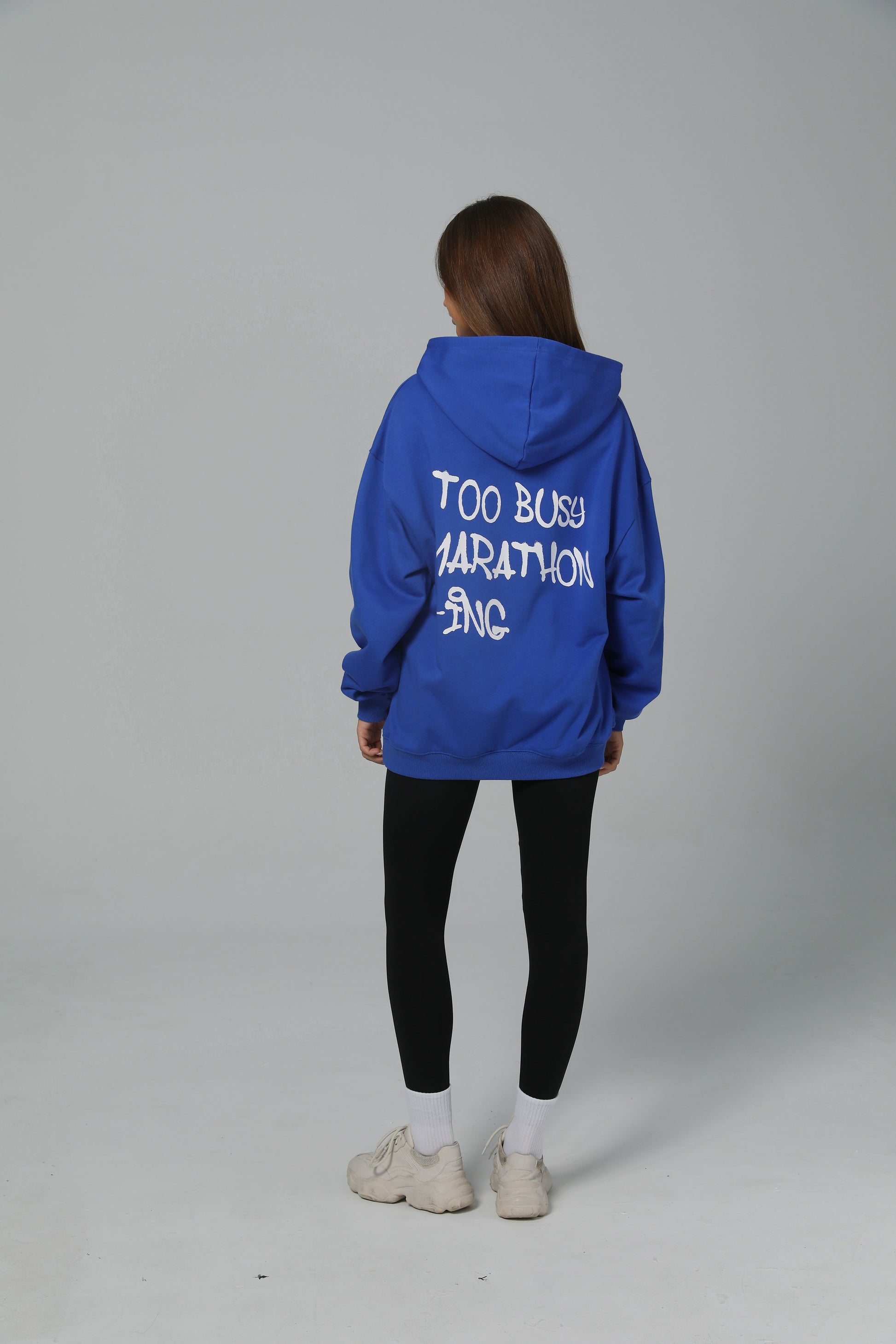 Royal Blue hoodie with an oversized fit, crafted from a heavy weight jersey cotton. Super soft, pre-shrunk and piece dyed for the ultimate jersey. Ribbed hem & cuffs. "Too Busy Marathon-ing" print to the back.