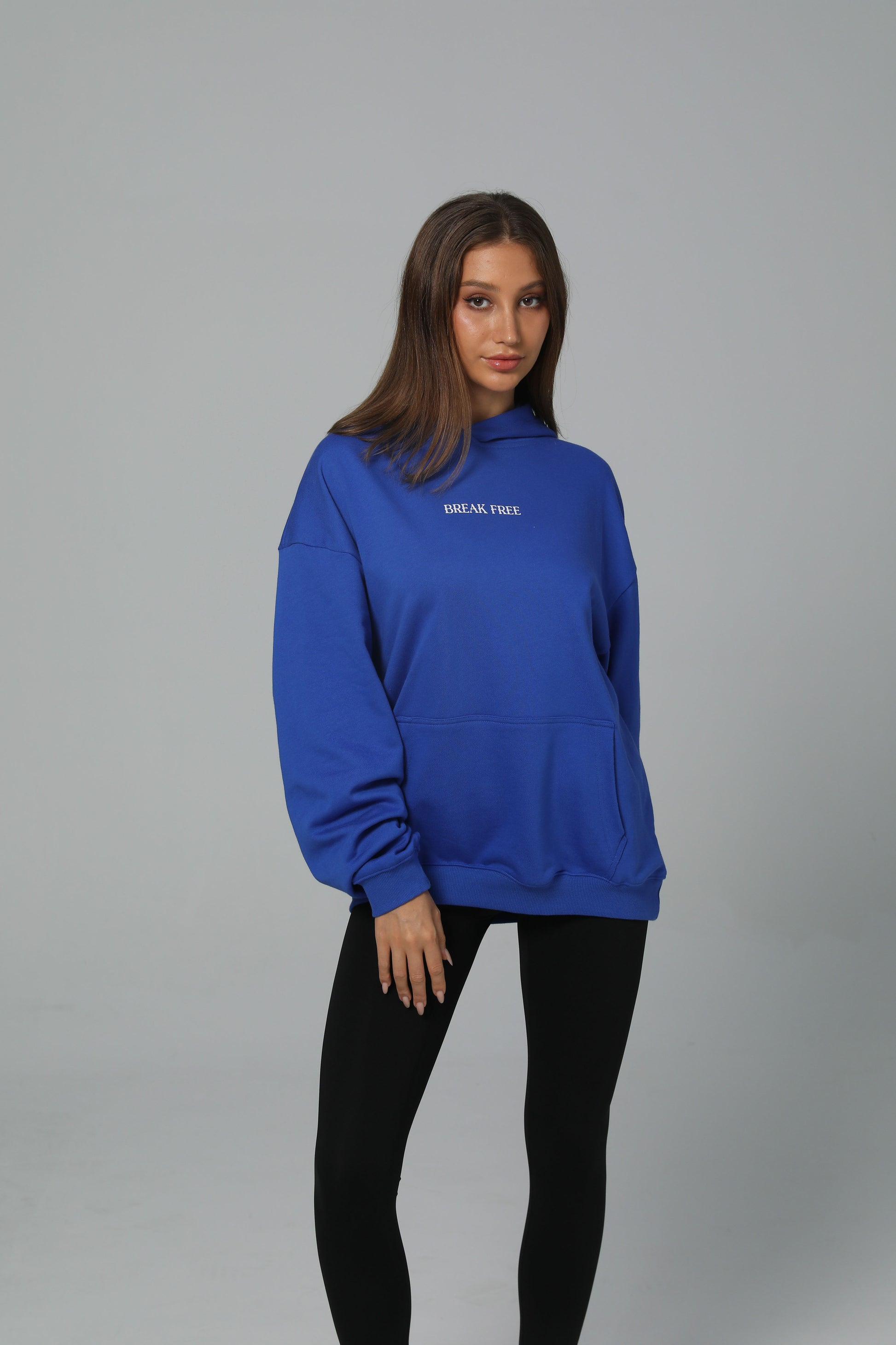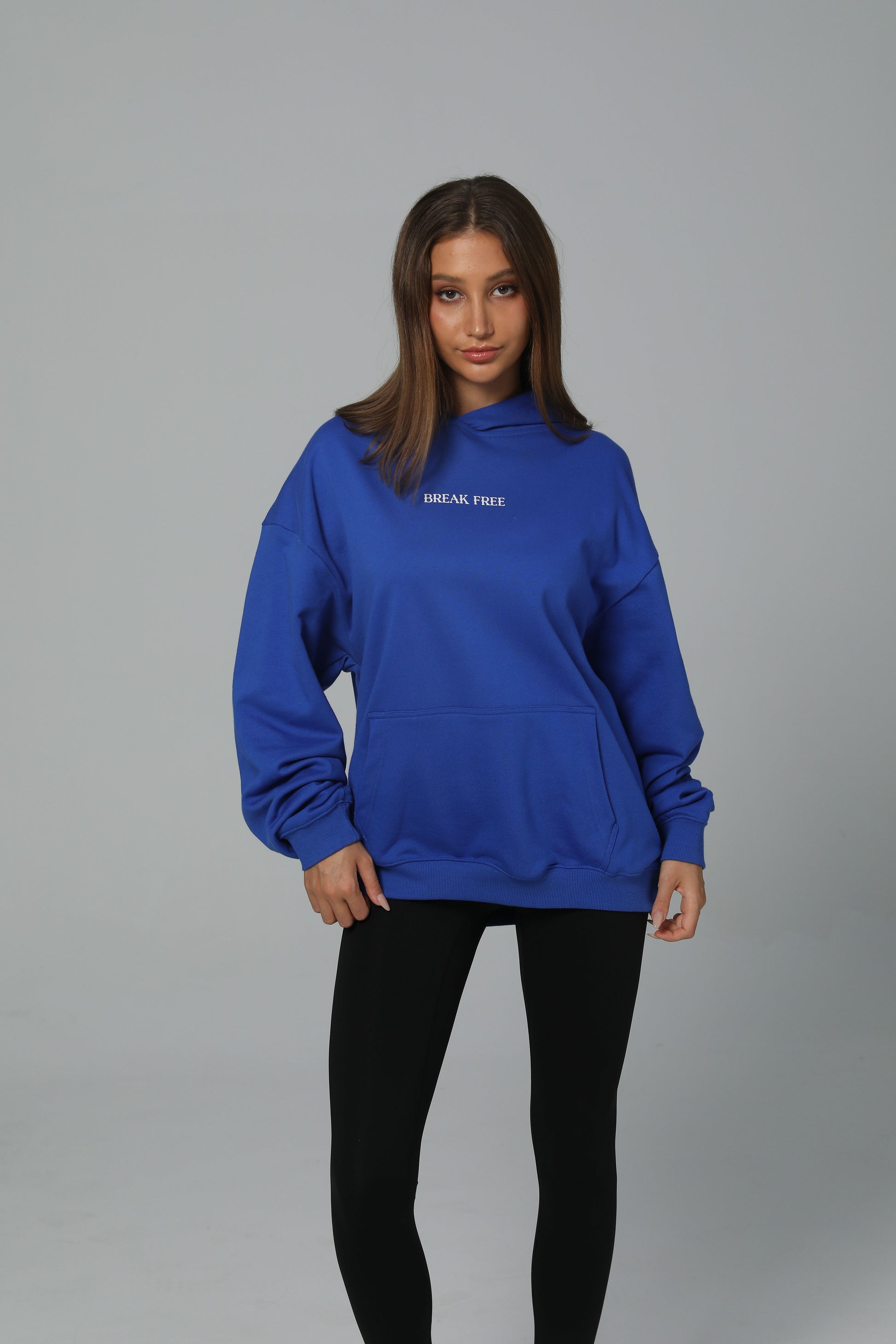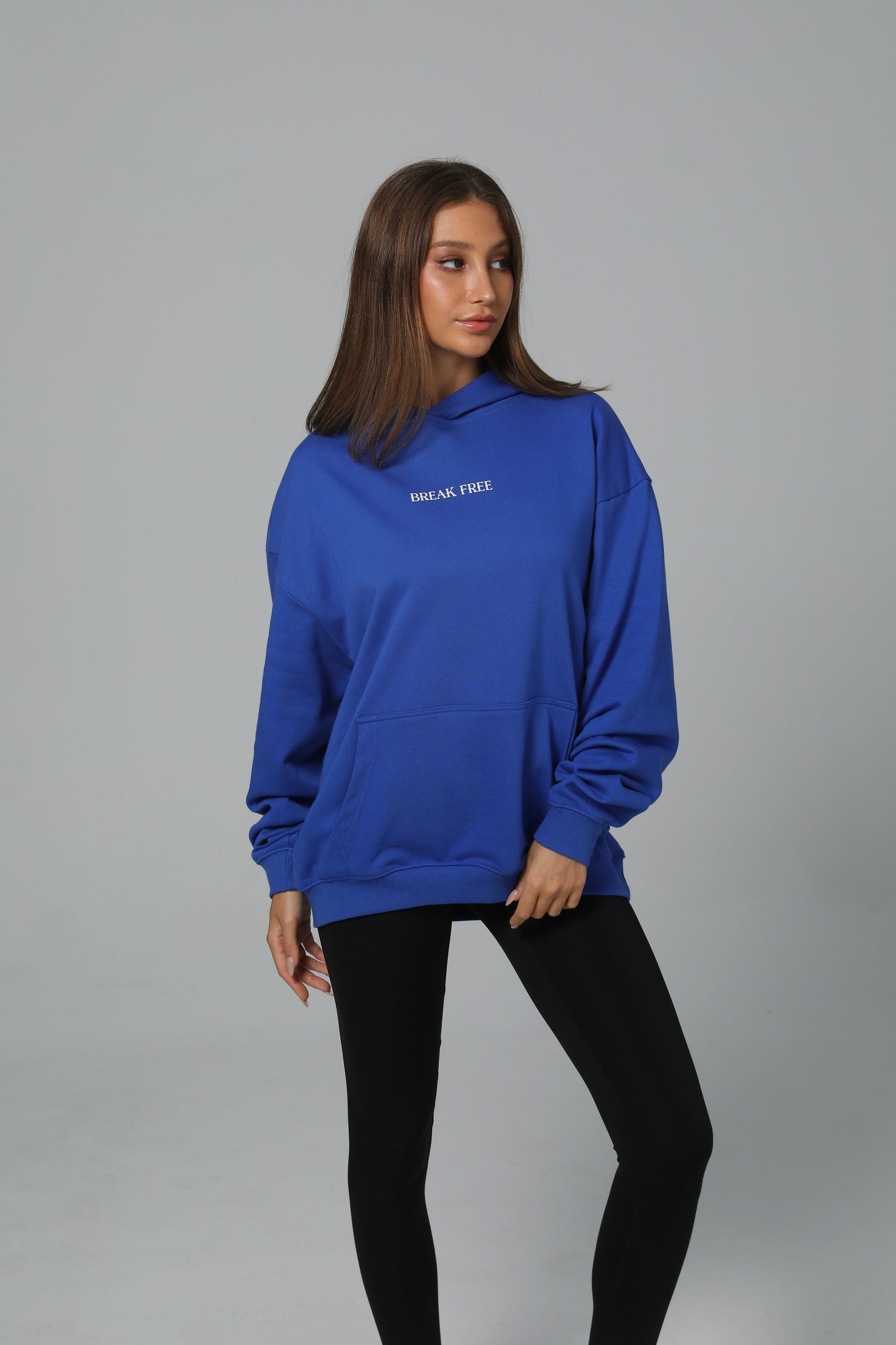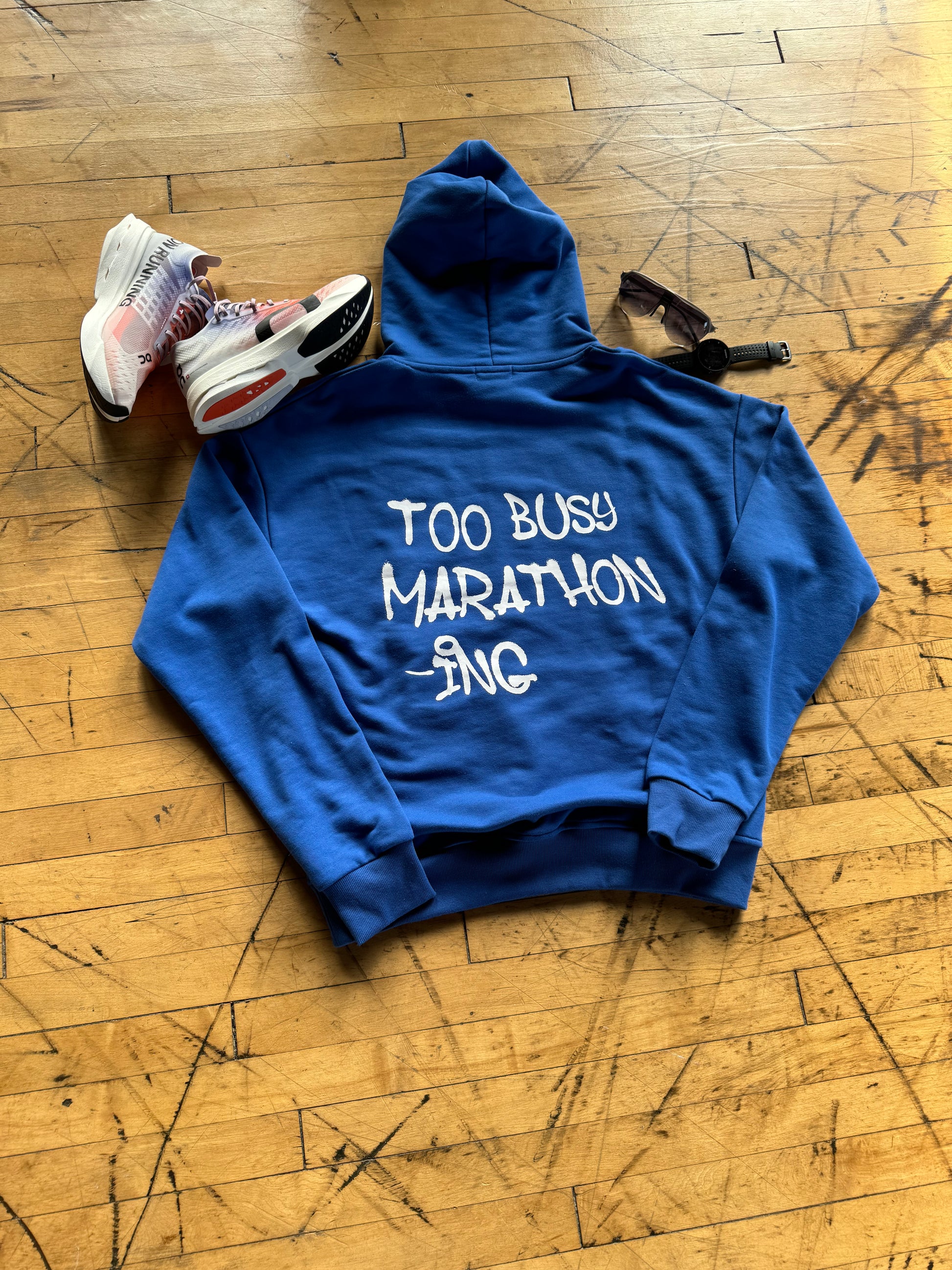 Royal Blue hoodie with an oversized fit, crafted from a heavy weight jersey cotton. Super soft, pre-shrunk and piece dyed for the ultimate jersey. Ribbed hem & cuffs. "Too Busy Marathon-ing" print to the back.